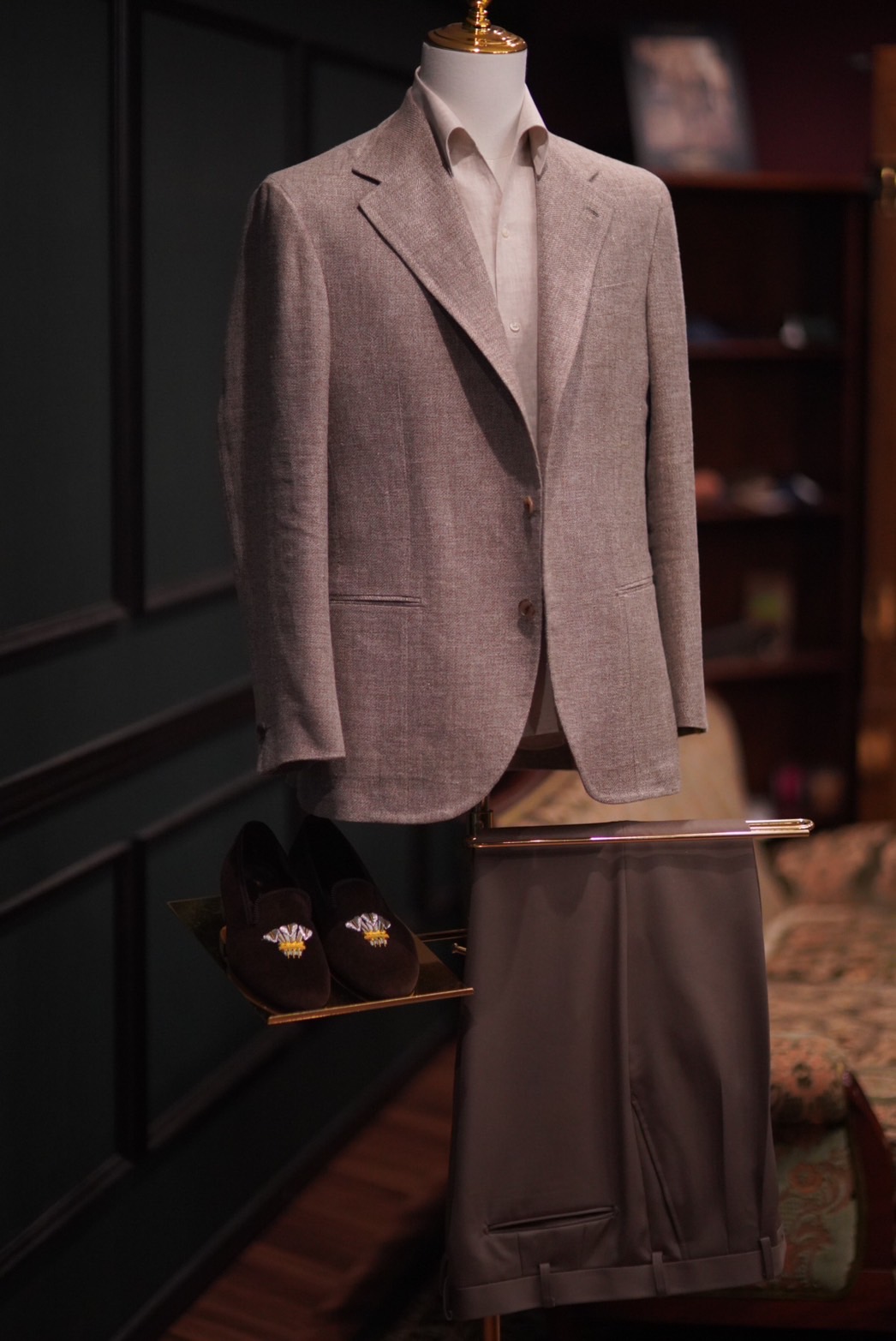 H様 シングルスーツ オーダー事例 【生地について】 英国名門「Holland & Sherry」のライトベージュ生地を使用。 上質なウールの風合いと繊細な色味が特徴で、軽やかさと品格を兼ね備えています。 春夏シーズンにぴったりの明るいトーンで、Continue reading "H様 シングルスーツ オーダー事例"