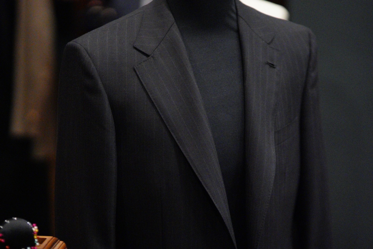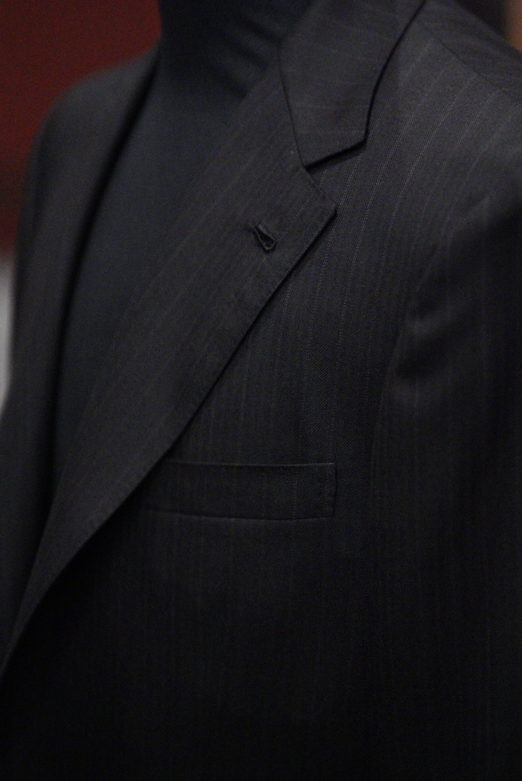 今回は、国産のプレミアムフレックス生地を使用した、グレーストライプのシングルスーツをオーダーメイドいたしました。