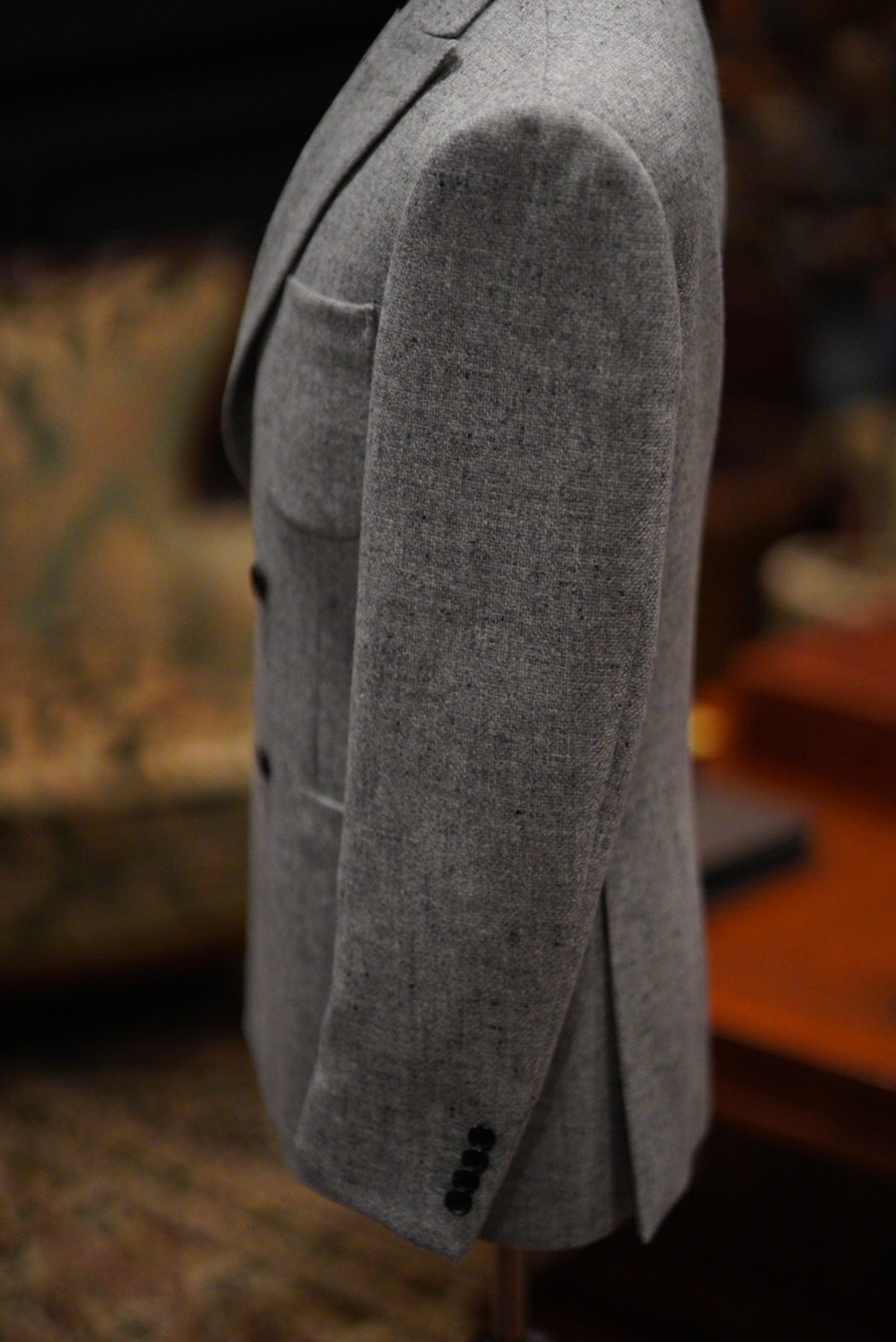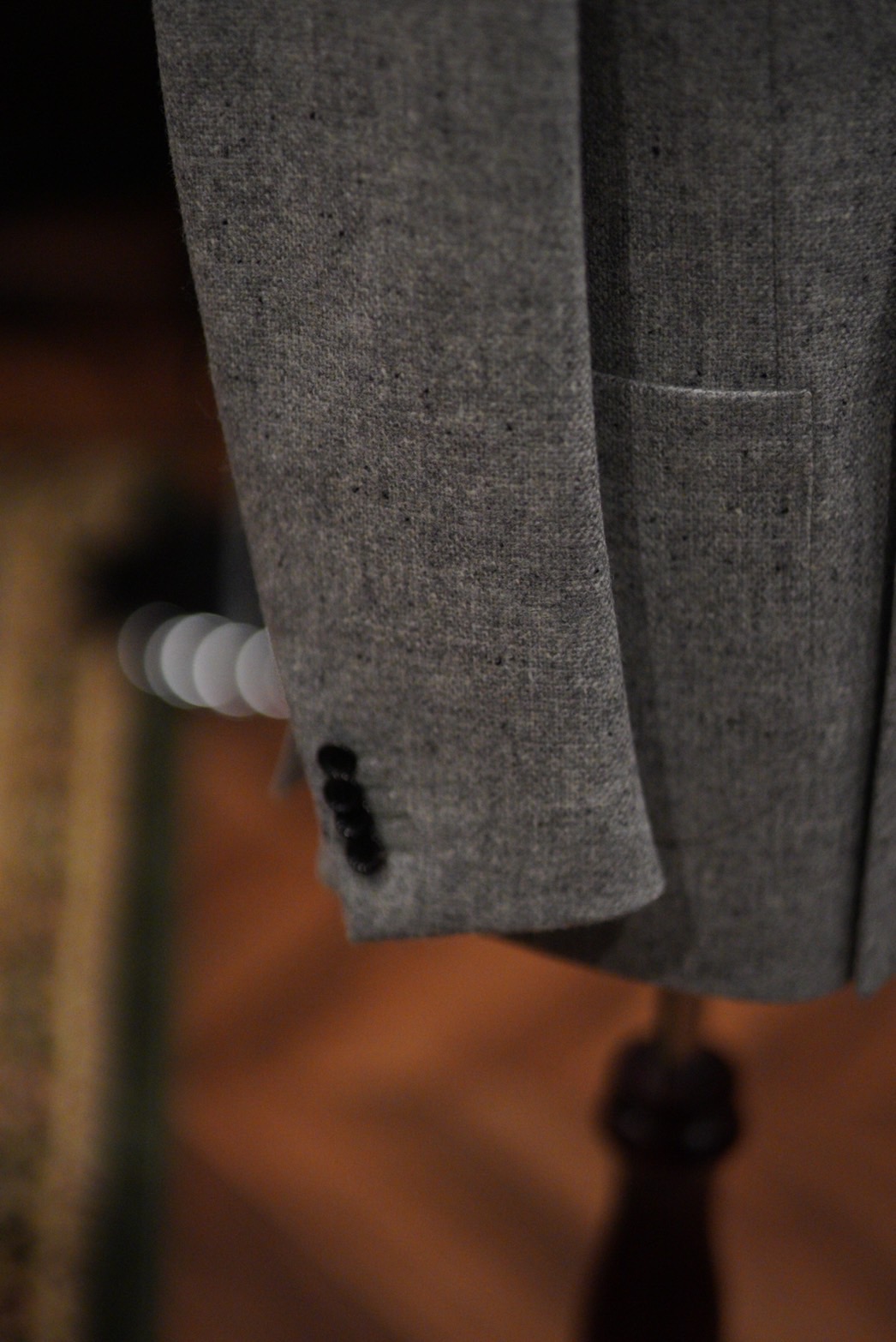 選ばれたグレーの生地は、さりげない織りのパターンが特徴で、光の当たり方によって様々な表情を見せます。