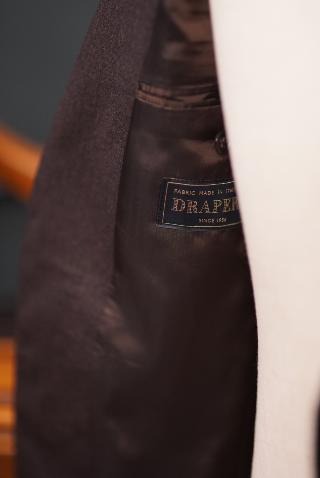 今回納品させていただいたのは、イタリアの名門「Drapers」の生地を使用したシングルスーツです。