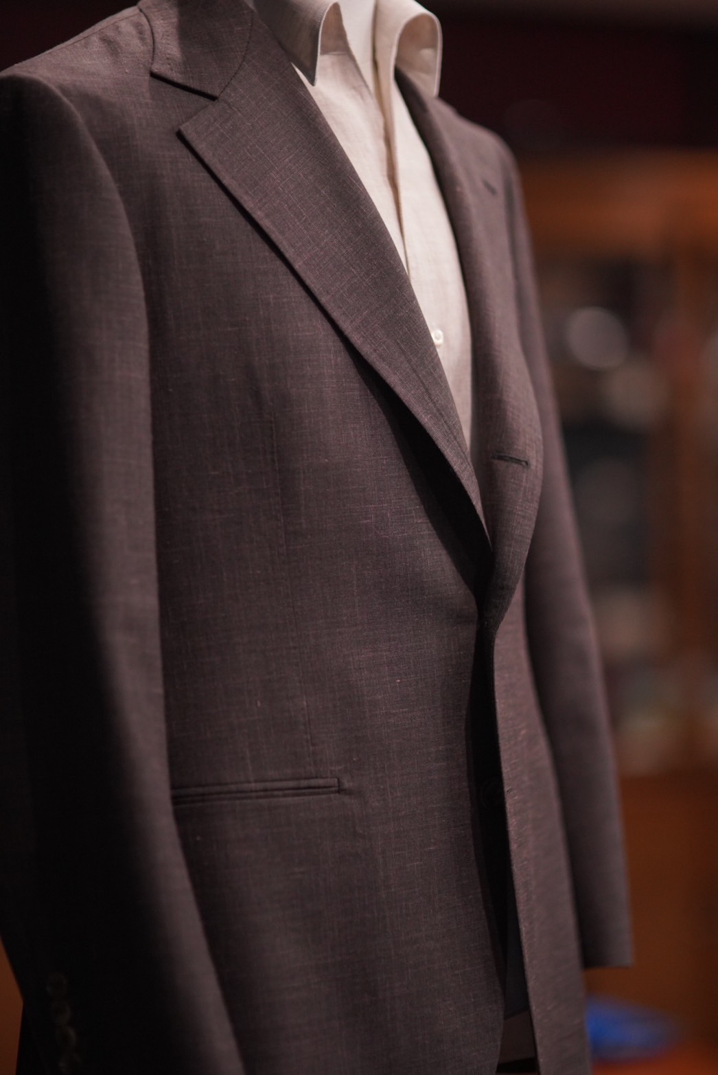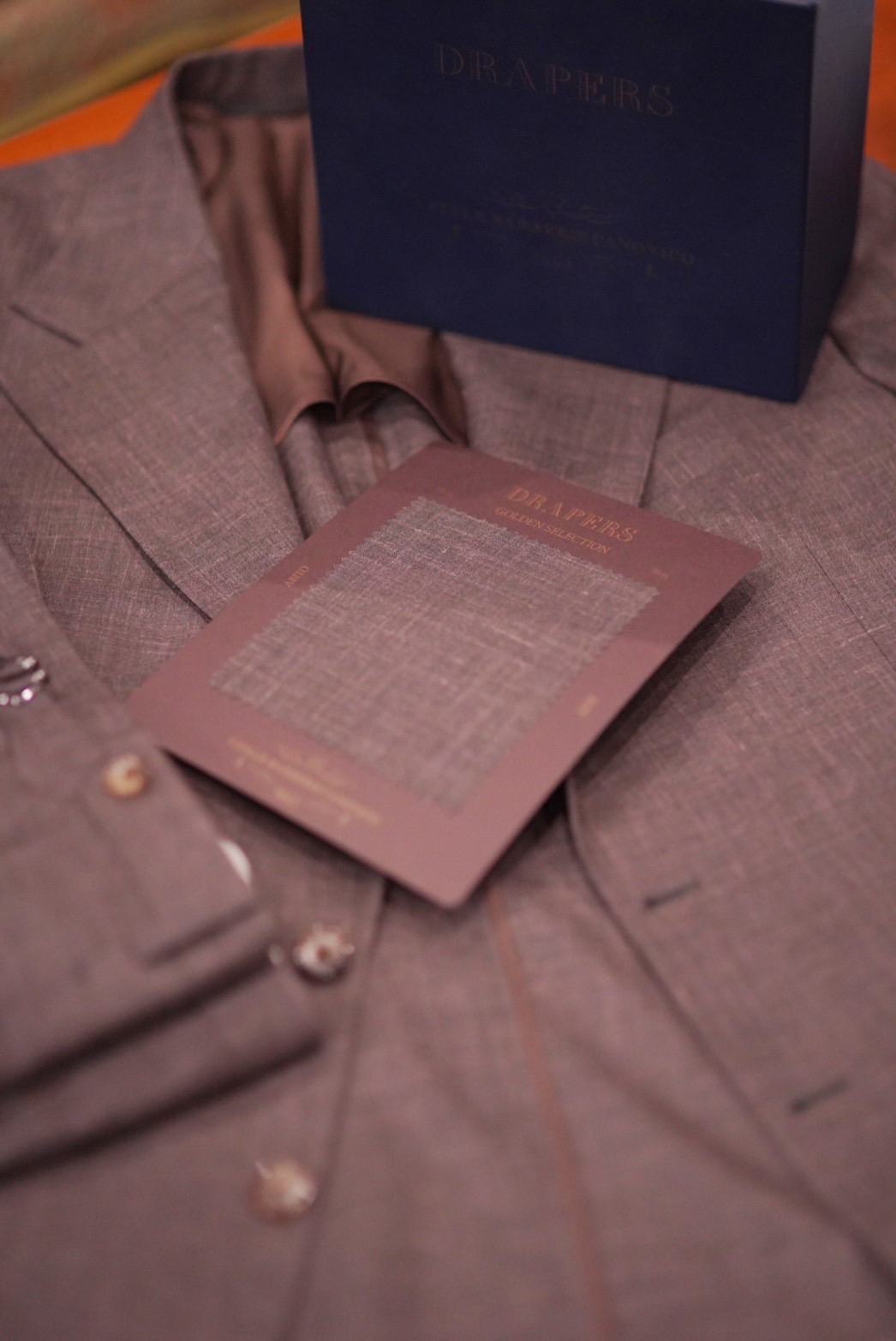 G様よりご依頼いただいたシングルスーツは、イタリアの名門マーチャントであるDRAPERS(ドラッパーズ)の「Golden Selection」コレクションから厳選した生地を使用し、エレガントで洗練された一着に仕上げました。