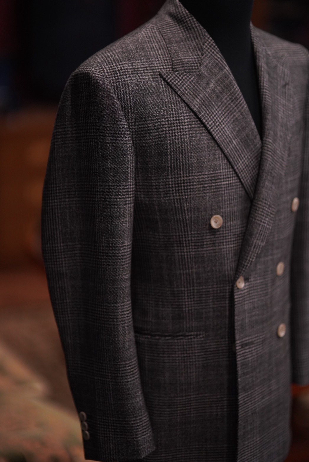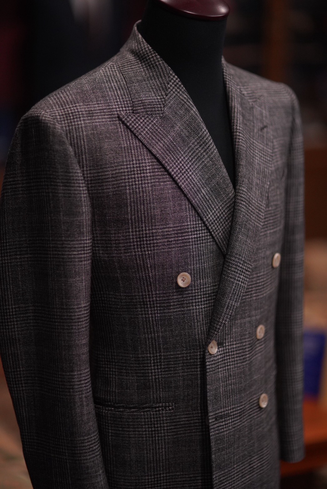 Loro Pianaの生地特有のしなやかな落ち感と艶が、ダブルブレストの存在感をより引き立てる仕上がりに。